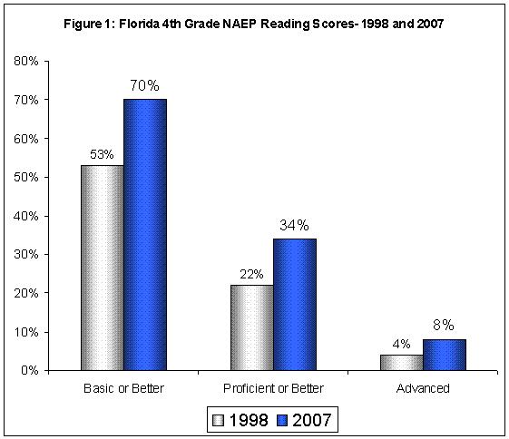 I have several times noted the vast improvement in Florida’s 4th Grade Reading NAEP scores on this blog. Figure 1 below demonstrates just how large that improvement has been between 1998 and 2007. For those who don’t have an excel spreadsheet open, that is a 32% increase in students scoring Basic or above, a 54% increase in those scoring Proficient or better, and a 100% increase in the percent scoring at the advanced level.