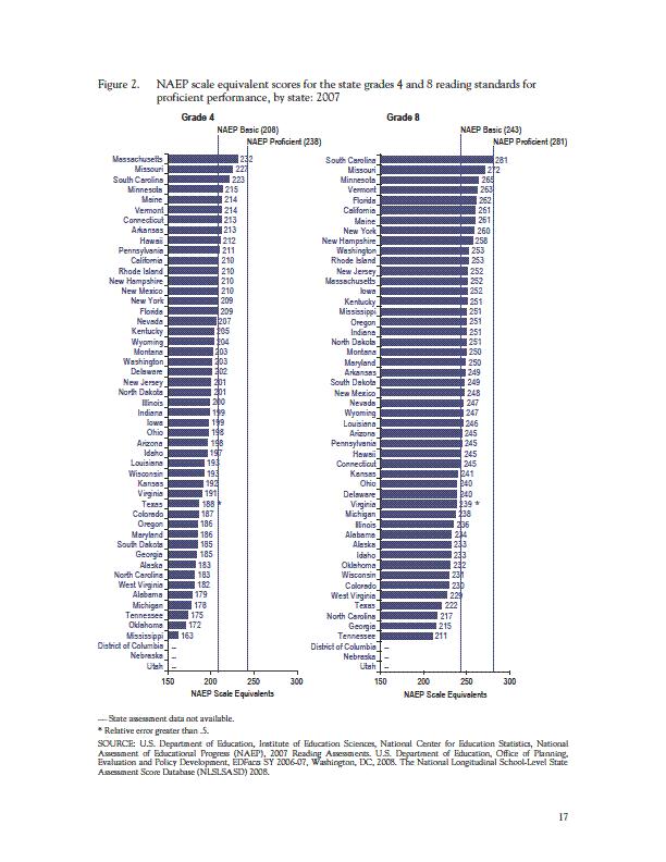 Above is a table from a NAEP study which used an equating procedure to determine where the “proficiency threshold” for each state’s exam would compare to the NAEP 4th and 8th grade reading exam. As you see, many states have proficiency cut scores which would merit a child a “below basic” score on NAEP. No state makes the equivalent of proficient on a 4th grade reading test equivalent to the 4th grade NAEP, and only one state does so on the 8th grade exam.