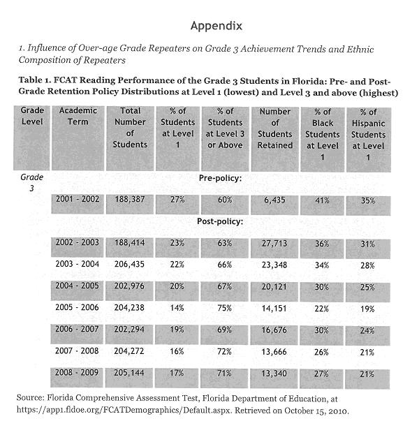 This page comes directly from the review. Notice that by the information gathered by the reviewer herself, the percentage of Florida students scoring FCAT 1 (the lowest possible score and the score making a student eligible for retention) in 3rd grade fell from 27% in 2001-02 to 17% in 2008-09. That’s almost a 38% decline.