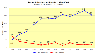 In the first year of the Florida grading system, 677 schools graded out D or F while only 515 schools earned A or B grades. The year before, in 1998, Florida’s 4th Grade NAEP reading scores were 5th from the bottom, so this was truth in advertising. On four separate occasions, policymakers raised the standards to receive an A or B grade, but you can see the trend for yourself: now there are more than 10 times the number of A/B grades as D/F.