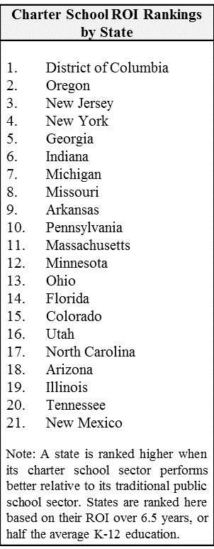 What really matters, though, is how learning translates into future economic rewards for the student and society, commonly measured as ROI.  The charter sectors in 20 states and D.C. all outperform traditional public schools.  The weighted average ROI advantage from charter schooling across the national sample is almost 3 percent for a single year in a charter school and 19 percent if students spend half of their K-12 education in a charter.