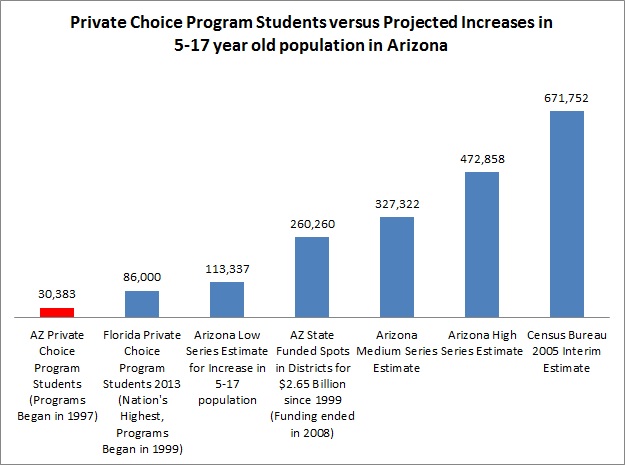 So estimates for the increase in the 5-17 year old population increase between 2010 and 2030 range from just under four times the current private choice program population at the extreme low-end to almost 22 times on the high-end. It’s worth noting that 4 year olds are eligible to receive public assistance for preschool in Arizona, that many 18 year olds are still in school, and that some students start school younger and stay in the public school system until age 21, but that is mostly just piling on. The state spent $2,650,000 between 1999 and 2008 on new district spaces despite the private choice and charter programs, and can no longer afford to do so. Mind you that $2,650,000 built more space in one of the lower performing public school systems in the nation if you judge by NAEP scores, but even this is really no longer financially feasible.