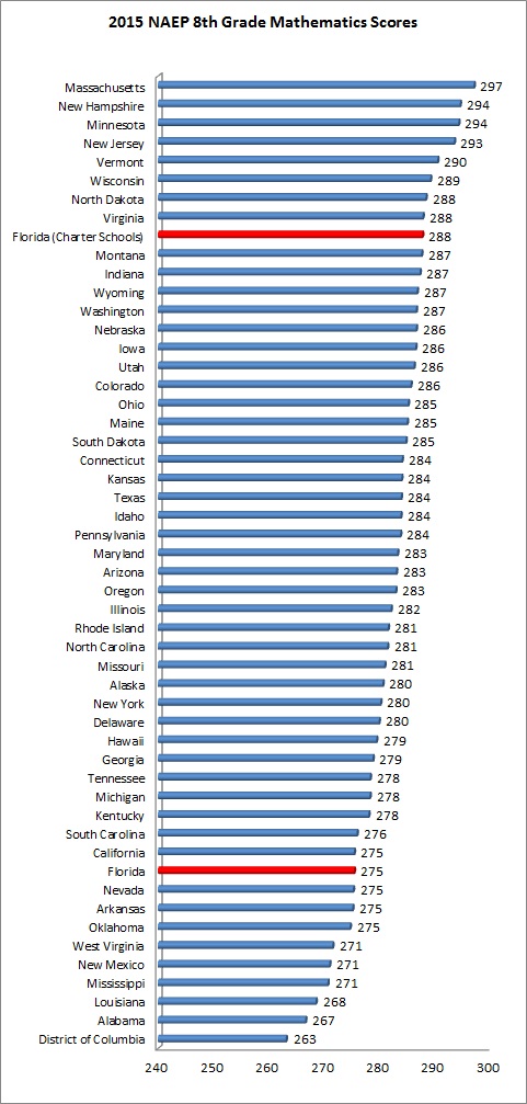 So digging around in the data reveals that Florida charter schools were unaffected by the swoon- their 8th grade math scores were flat between 2013 and 2015- and delightfully high to boot (see chart).