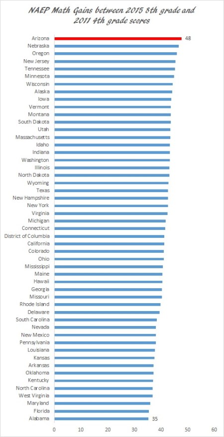 1. It should be noted that Arizona’s impressive cohort gain produced an 8th grade NAEP math score at the national average in 2015. The AZ 2015 4th grade score is slightly below the national average.