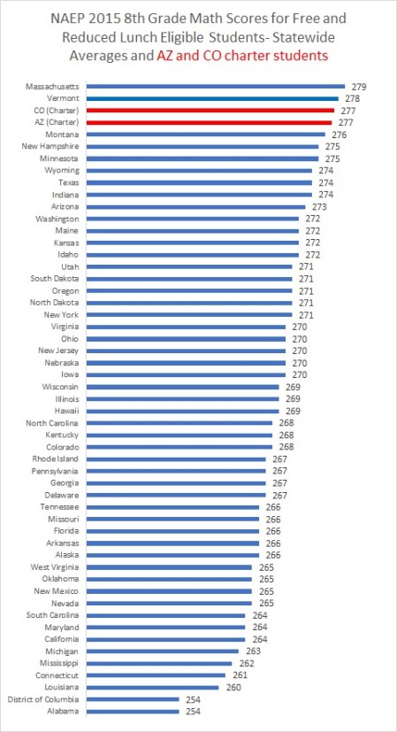 Want proof- here is how “9/33” charter sectors did on the 2015 NAEP 8th grade math test. First let’s look at middle and high income kids in Arizona and Colorado charters compared to the statewide averages for middle and high income kids: