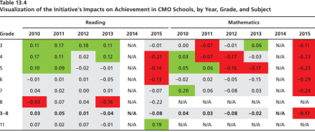 I see a lot more red (significant and negative effects) than green (significant and positive). The report’s overall conclusion is technically true only because it focuses just on the last year (2014-15) and because it examines each of these 4 sites separately. A combined analysis across sites and across time, which they don’t provide, would likely show a significant and negative overall effect on test scores.