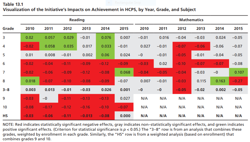 I see a lot more red (significant and negative effects) than green (significant and positive). The report’s overall conclusion is technically true only because it focuses just on the last year (2014-15) and because it examines each of these 4 sites separately. A combined analysis across sites and across time, which they don’t provide, would likely show a significant and negative overall effect on test scores.