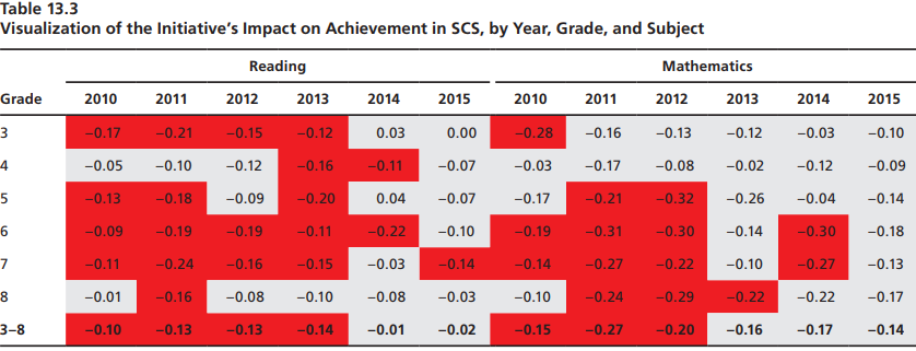 The difference in difference analysis that Rand is using is not perfect at isolating causal effects. And as the report notes, comparison districts were also sometimes implementing similar reform strategies as the Partnership sites. But you would expect that the injection of several hundred million dollars and considerable expert attention would improve implementation in the Partnership districts, so the comparison is still informative. Besides, the fact that some comparison districts were pursuing some of the same reforms does not explain the splattering of red (negative and significant effects) we see.