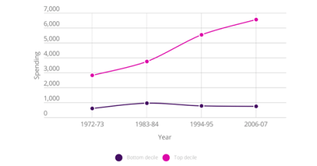 Research from Sabrino Kornrich and Frank Furstenberg tracks enrichment spending by family decile income. The above chart tracks trends in enrichment spending by the top and bottom deciles of income over time. As you can see, upper income families are enriching with increasing gusto, while lower-income families have flat enrichment expenditures.