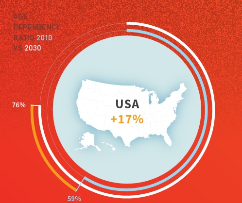 The Baby Boom generation has already started retiring, and will be sending their grandchildren off to school. The United States Census Bureau projects the percentage of working age people to shrink in every state, meaning fewer people in the prime earning (and thus taxpaying) years to support a growing number of seniors and youth. All states will be getting older, with only a handful of states projected to have a smaller elderly population than 2010 Florida by 2030. Many states also face large projected youth population increases. With Medicaid currently constituting 23 percent of the average state budget and education approximately half, a fierce battle between the need for health and education spending looms with fewer working age people to foot the bill.