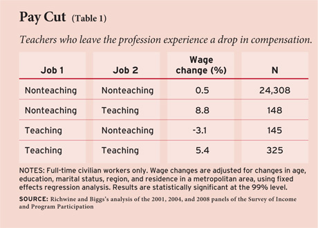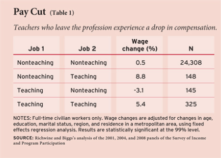 Andrew and I showed that, if anything, the opposite is true: Individuals get an average salary increase of 8.8 percent when they enter the teaching profession and a pay cut of around 3.1 percent when they leave.