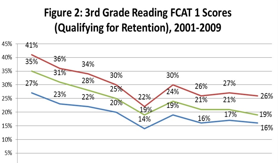 The individual impact of particular policies on gains in Florida is not clear. What is crystal clear however is the fact that there were aggregate level gains in Florida. You don’t require a random assignment study or a regression equation, for instance when considering the percentage of FCAT 1 reading scores (aka illiterate) above. When you see the percentage of African American students scoring at the lowest of five achievement levels drop from 41% to 26% on a test with consistent standards, it is little wonder why policymakers around the country have emulated the policy, despite DiCarlo’s skepticism.