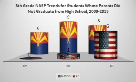 At the 8th grade level, NAEP allows for tracking student achievement by the education status of their parents. This is what it looks like for students whose parents did not finish high school for the entire period we can track all three tests: