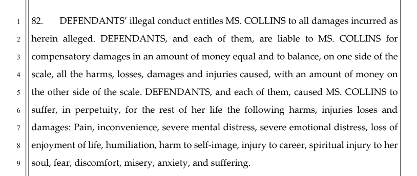 And what, exactly, is she suing over, given that she did not lose her job, nor a penny of her salary? Buckle up: Relieving her of her committee assignments is “illegal” and has caused Collins “spiritual injury to her soul” that will haunt her “in perpetuity, for the rest of her life.”