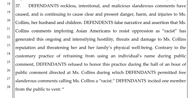 As Mason Hartman put it succinctly: “The complaint is essentially arguing that Alison Collins had a constitutionally-protected right to tweet racial slurs without (nonmonetary) impact to her employment, but that her fellow board members should have to compensate her for merely allowing the public to comment on them…I think Alison Collins might genuinely believe that it’s illegal to call her a racist.”