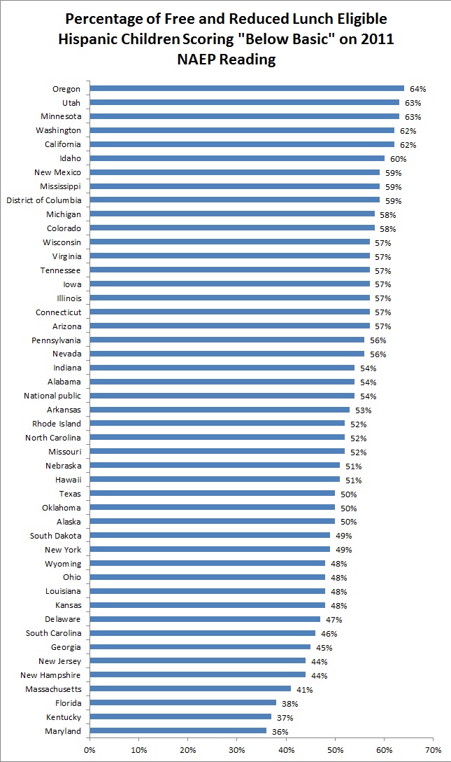 But I digress. The chart here ranks states by the percentage of low-income Hispanic students scoring “Below Basic” on the 4th grade NAEP reading exam in 2011.