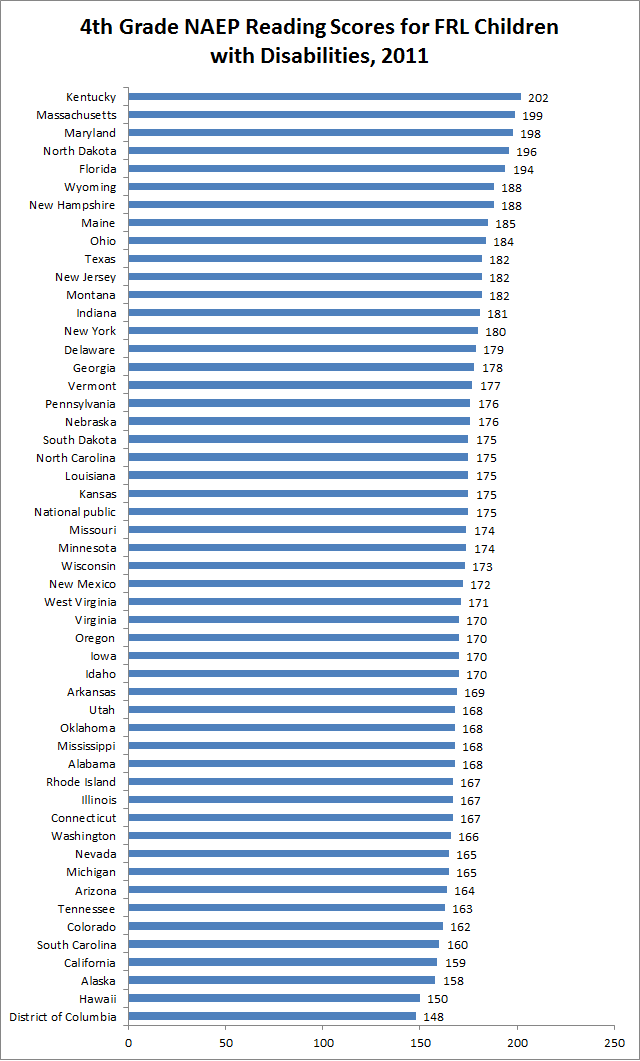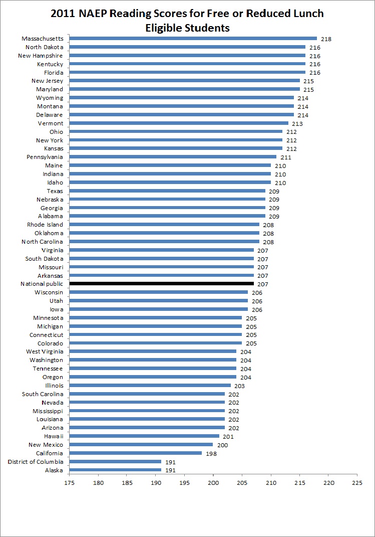 The chart on the right presents scores for Free and Reduced Lunch Eligible students on the 2011 NAEP 4th grade reading test. Memo to self: remember not to come back as a poor kid in Alaska or DC in the next life. Ten points roughly equals a grade level worth of progress. Low-income kids in Alaska and DC are reading almost as poorly as 1st graders in Massachusetts, which is to say, not much all.