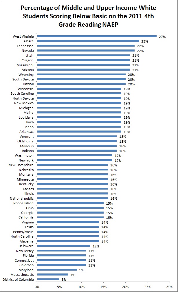 Before proceeding to dwell on West Virginia and others, I should note that DC has finally come in first place in something! If you are an ultra-wealthy White student going to one of the highly exclusive public schools in Georgetown, your reading ability rocks. Congratulations to the portion of the DC school into which few poor kids ever step foot much less attend.