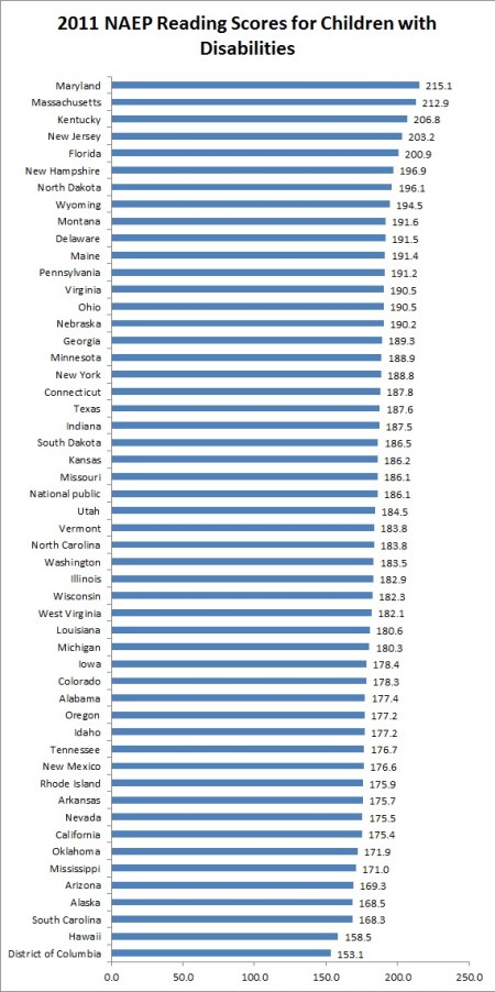 Maryland led the nation in gains among children with disabilities….or did they? Maryland’s inclusion rate for children with disabilities on the 4th grade reading test in 2011: 31%, which though completely pathetic actually beat the 30% rate for children with disabilities on the 8th grade reading test. The ELL rates were almost as bad.