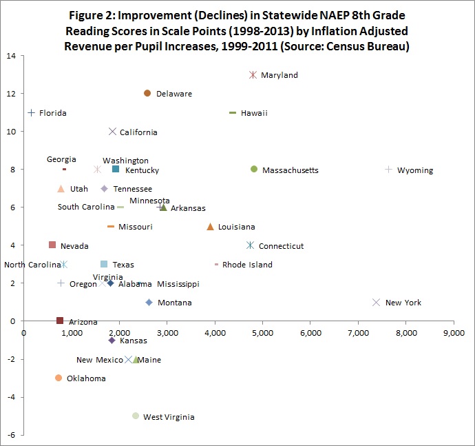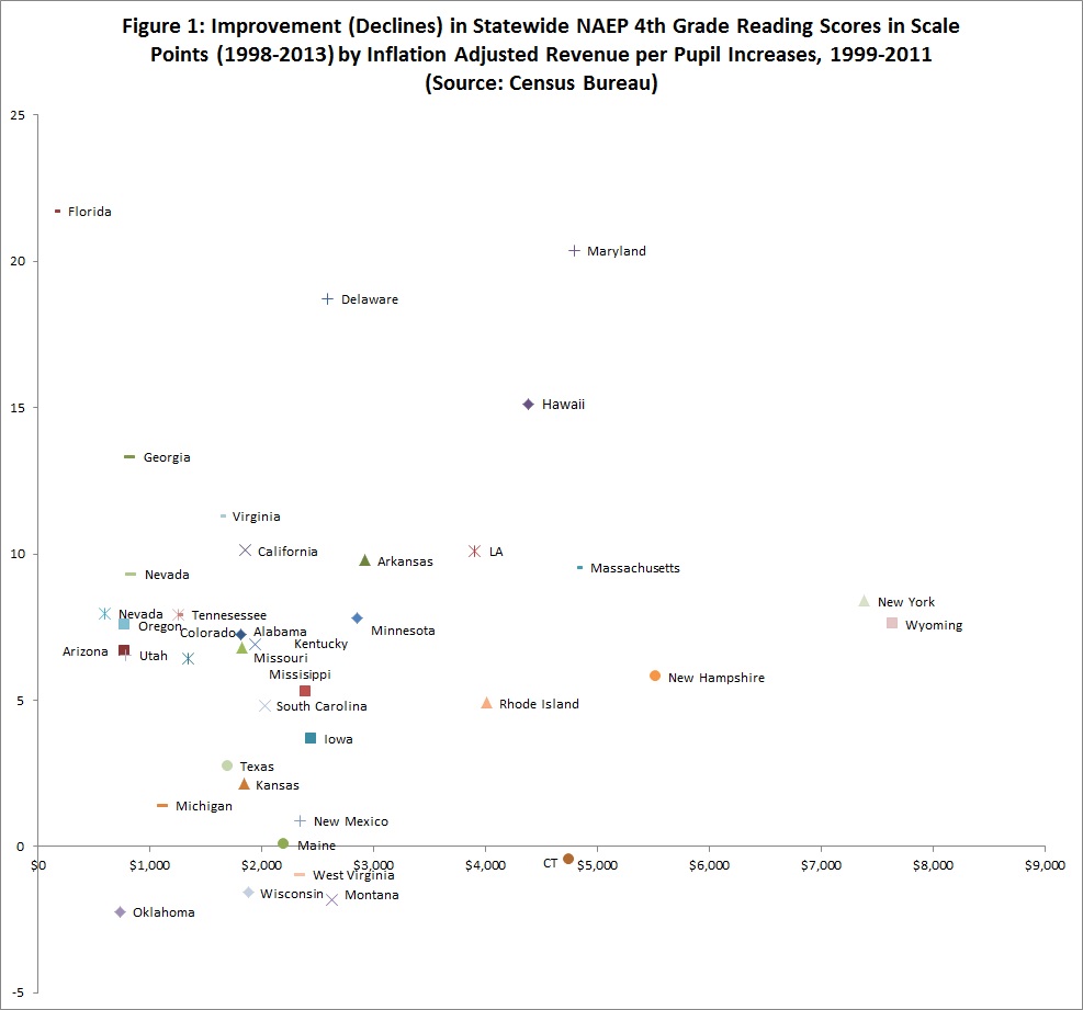 I decided that it would be a bit easier to digest to do the chart by individual subjects and use points rather than percentages of a standard deviation and combined tests as an axis. Also revenue per pupil was easier to find than expenditures. So what you see up there is a first crack at 4th grade reading between 1998 and 2013. No shock- money is still not the answer (yes I am looking right at you New York and Wyoming).