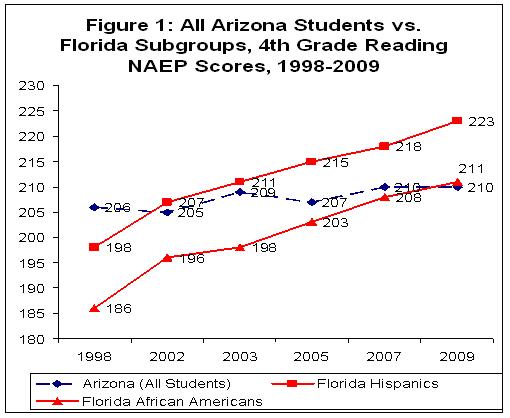 In 2007, Florida’s Hispanic students outscored 15 statewide averages for all students on 4th grade reading. Two years later, Florida Hispanics tied or outscored 30 statewide averages. Florida’s Hispanics scored 13 points higher than the statewide average for all students in Arizona in 2009, over a grade level worth of learning (10 points roughly equaling a grade level’s worth of learning).