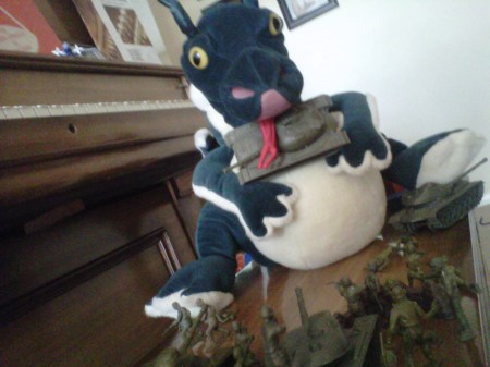 Last week I allowed them to watch a couple of Godzilla flicks, which led to the reactment on the piano bench you see above.