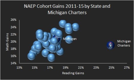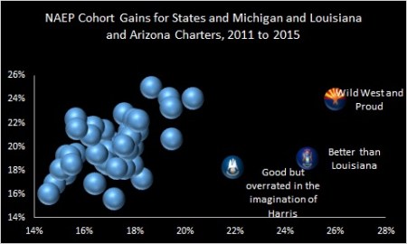 The NAPCS dashboard that keeps track of such things is currently down but last I checked both LA and MI charters had tough student demographic profiles. We cannot know what role average school quality plays in these trends, so it is barely possible that statistical noise is consistently bouncing the way of Michigan charters over and over again (the 2015 exams also favor them) and consistently bounce against Louisiana charters repeatedly (the 2015 results were also trending down). Multiple formal studies of state scores in Michigan showing positive results leans heavily against such an already unlikely conclusion, as do similar negative trends in state charter scores in Louisiana.