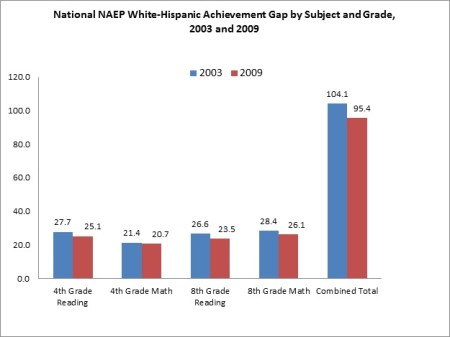 In Jay’s post below, you can watch a Fordham discussion that includes debate over whether we have fallen into the grip of “achievement gap mania.” If so, we have precious little to show for it. We did have some narrowing of the achievement gap between 2003 and 2009, but at two and a half plus grade level gaps in all four subjects. Start your low-calorie, carrot juice diet and mark your calendar for 2075 or so, assuming that we can maintain today’s glacial pace of closing.